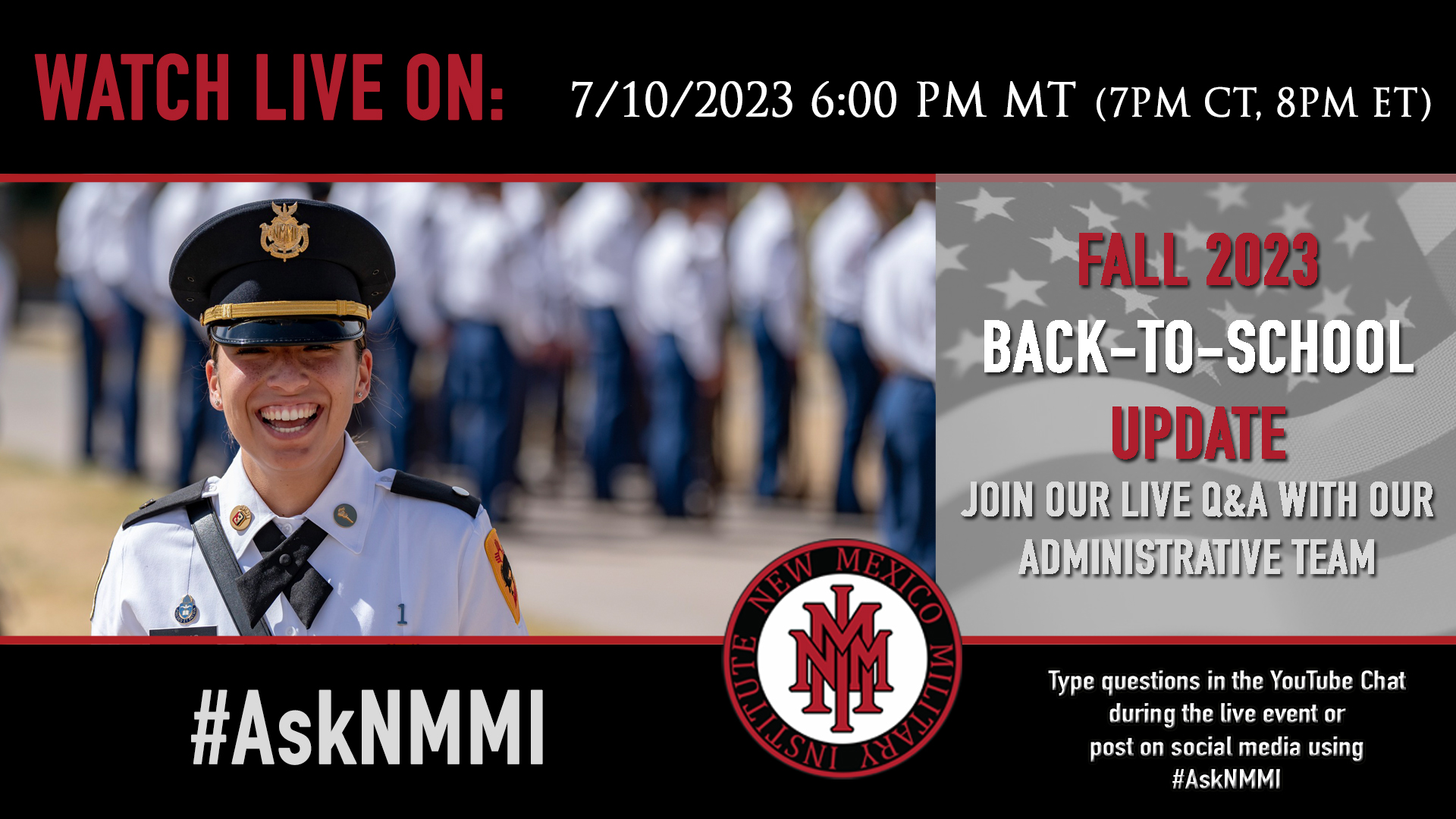 Watch the event live from a link on our home page (LINK TO www.nmmi.edu), find a link to it on our social media at the time of the Q&A, or click here (LINK: https://www.youtube.com/watch?v=2IBG5nMBato).